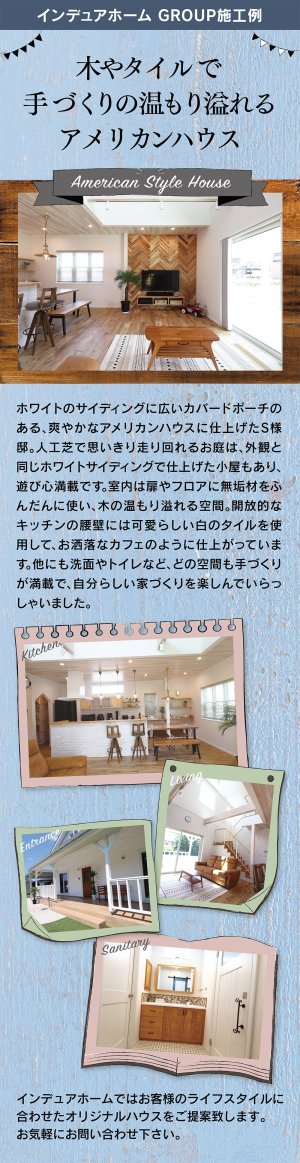 ヴィンテージスタイル、カリフォルニアスタイル、フレンチスタイル、プロヴァンススタイル、アメリカンスタイル、モダンスタイルの家のことなら、私たちインデュアホーム香川西が、こだわりの住宅を自信をもって心を込めておつくりします。自然素材の塗壁や、無垢のフロアーなどをふんだんに使用して、高性能でエコな住まいづくりを心がけています。新築(注文住宅)・リノベーションのお問い合わせは、お気軽にインデュアホーム香川西までご相談下さい。
