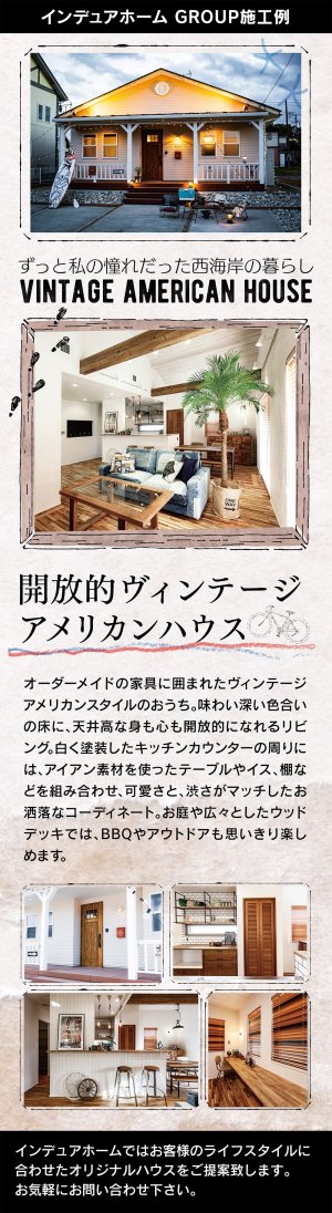 ヴィンテージスタイル、カリフォルニアスタイル、フレンチスタイル、プロヴァンススタイル、アメリカンスタイル、モダンスタイルの家のことなら、私たちインデュアホーム香川西が、こだわりの住宅を自信をもって心を込めておつくりします。自然素材の塗壁や、無垢のフロアーなどをふんだんに使用して、高性能でエコな住まいづくりを心がけています。新築(注文住宅)・リノベーションのお問い合わせは、お気軽にインデュアホーム香川西までご相談下さい。