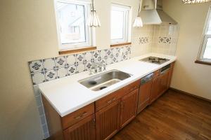 親御さんの敷地の中に建替えをさせて頂きました。既存の建物と違和感なく調和するように心がけてあります。フルタイムのお仕事をされている奥様の為にサンルームは必須でした。でもぽかぽかだからワンちゃんに独占されてるかなぁ??